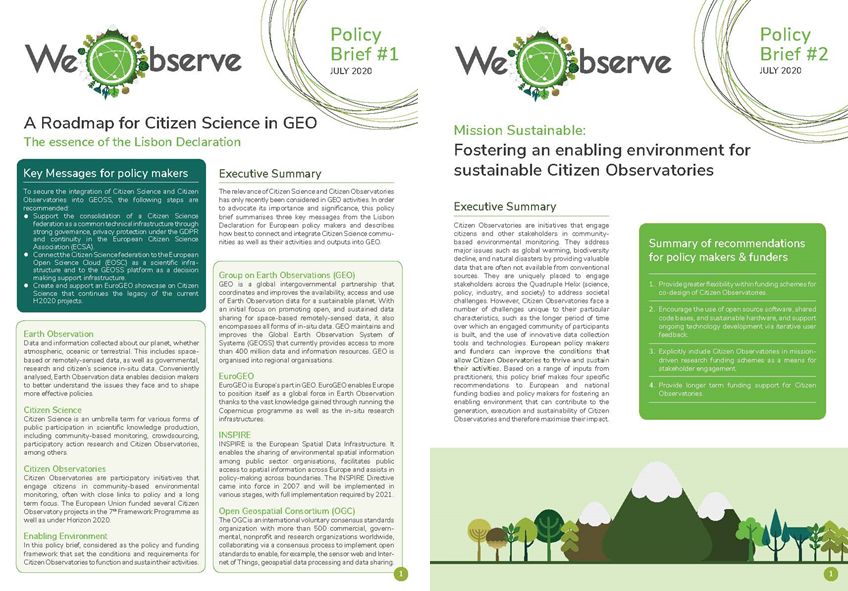 Example from the WeObserve projectThe WeObserve project has collected knowledge from Citizen Observatories, the WeObserve Communities of Practice, and other related initiatives and has consolidated these in two policy briefs with recommendations for policy-makers on how to foster Citizen Observatories to address environmental challenges. The first policy brief, entitled ‘A Roadmap for Citizen Science in GEO – The essence of the Lisbon Declaration’, aims to secure the integration of Citizen Science and Citizen Observatories into Global Earth Observation System of Systems (GEOSS). This policy brief summarises three key messages from the Lisbon Declaration for European policy-makers and describes how best to connect and integrate Citizen Science communities as well as their activities and outputs into GEO. The second policy brief, entitled ‘Mission Sustainable: Fostering an enabling environment for sustainable Citizen Observatories’, provides recommendations that can contribute to the generation, execution and sustainability of Citizen Observatories. Based on a range of inputs from practitioners, the policy brief makes four specific recommendations to European and national funding bodies and policy-makers for fostering an enabling environment that can contribute to the generation, execution and sustainability of Citizen Observatories, thereby maximising their impact.