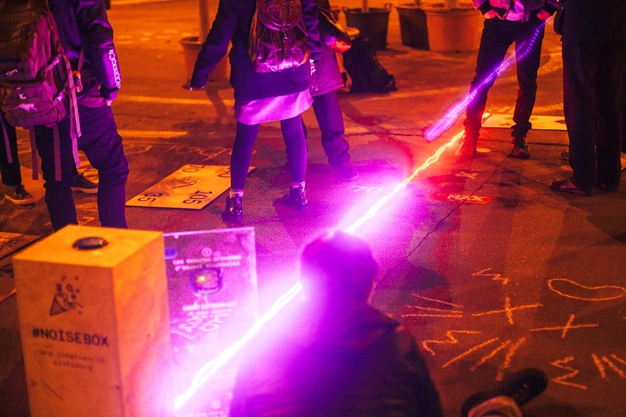 Participants of the Making Sense project in Barcelona take their interactive Noise Box to the streets of the city to communicate issues around noise pollution. © Making Sense
