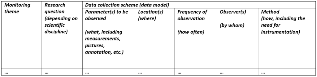 You can answer these questions by creating the following table that actually defines the data model (i.e., the form of each observation). This will help you ensure alignment of your approach and remain focused. It also allows you to keep an overview if your Citizen Observatory needs to address more than one monitoring theme.