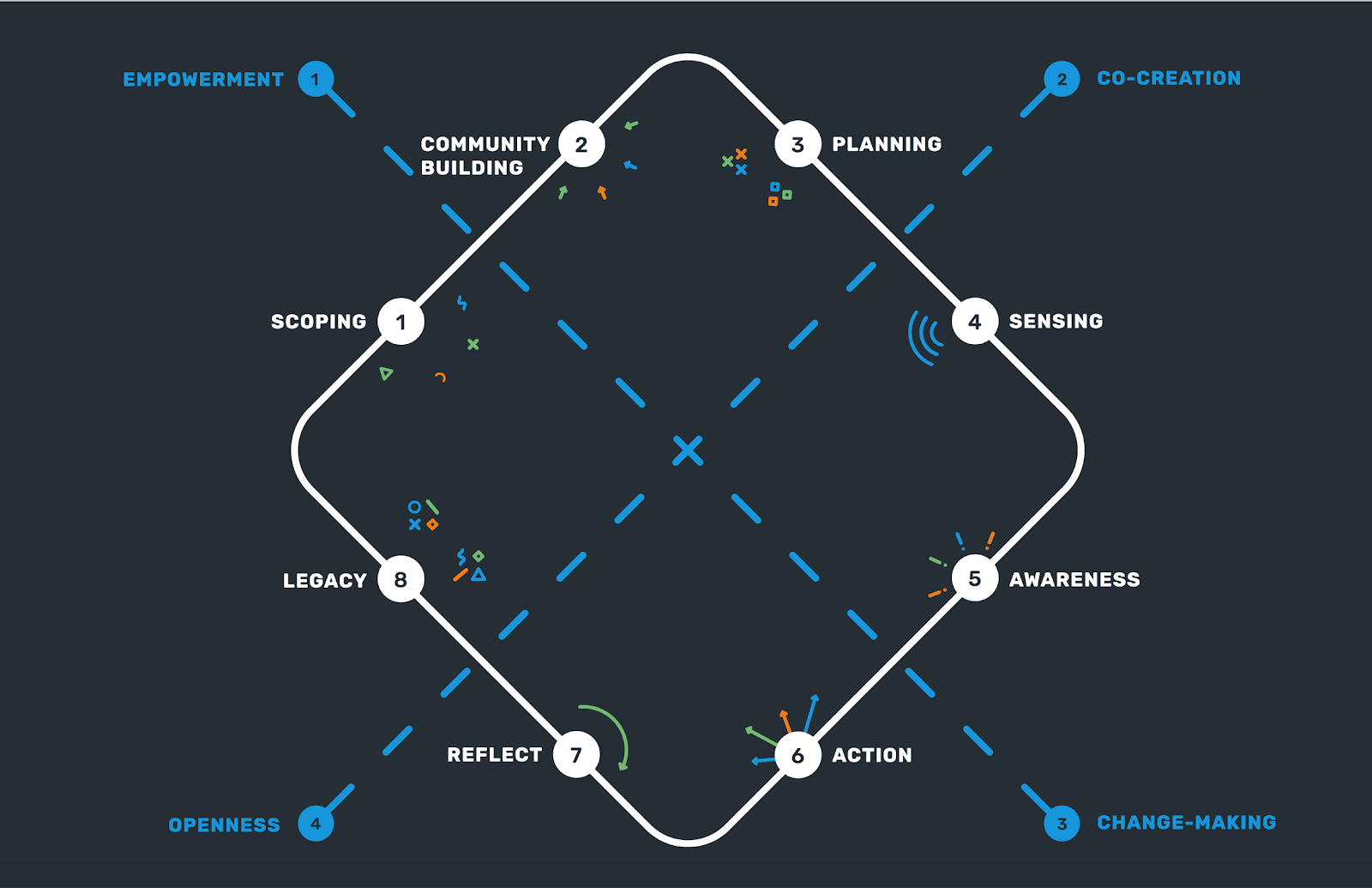 The steps are: Scoping, Community Building, Planning, Sensing, Awareness, Action, Reflect and Legacy. The cross-cutting principles are Co-creation, Empowerment, Openness, and Change-making.