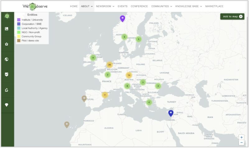 These Citizen Observatories have been mapped on the WeObserve website in a Citizen Observatory Landscape Map that continues to grow as other practitioners and initiative leaders add their own Citizen Observatory initiatives to the picture. It illustrates the growing range of Citizen Observatories across Europe and can be filtered to highlight different aspects such as project, entity, domain, status, scope and/or funding.