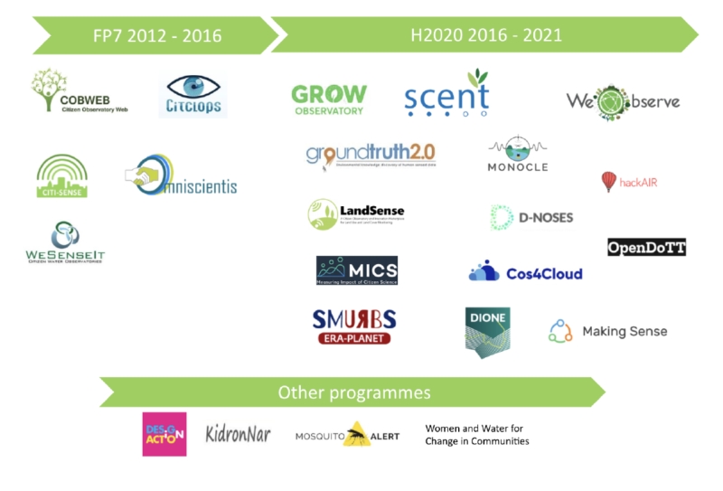 A comprehensive list of the Citizen Observatories and Citizen Observatory-type projects funded by the EU through the FP7 and Horizon 2020 programmes is shown in the table below. The list was taken from the “D2.9 Roadmap for the uptake of the Citizen Observatory knowledge base” (WeObserve Consortium, 2021).